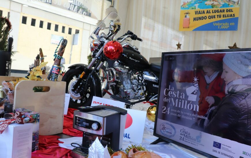 La Cesta del Millón puede verse ya desde este viernes 4 en un local comercial en el Parque de la Constitución. Una cesta que este año llega ya a su vigésima tercera edición, y que está valorada en 6.500 euros, además, de dos cestas con productos extremeños valorados en 500 euros cada una. La cesta del millón la obtendrá aquella papeleta cuyo número, coincida con el número del primer premio del sorteo de la ONCE que se celebrará el 11 de enero del 2021. Las dos cestas restantes, se le sumarán y se le restarán mil al número premiado.